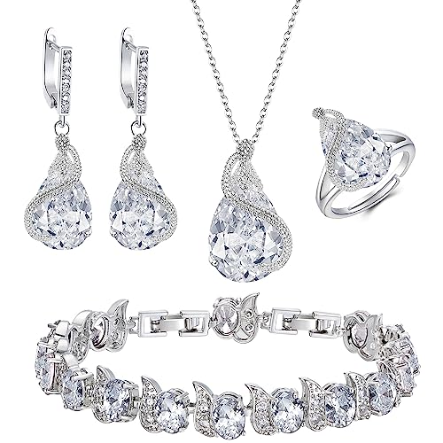 Ever Faith Women's Jewelry Set Bridal Jewellery Sparkly Cubic Zirconia Teardrop Necklace Earring Bracelet Ring Sets for Women Birthday Gifts 4 PCS Clear Silver-Tone