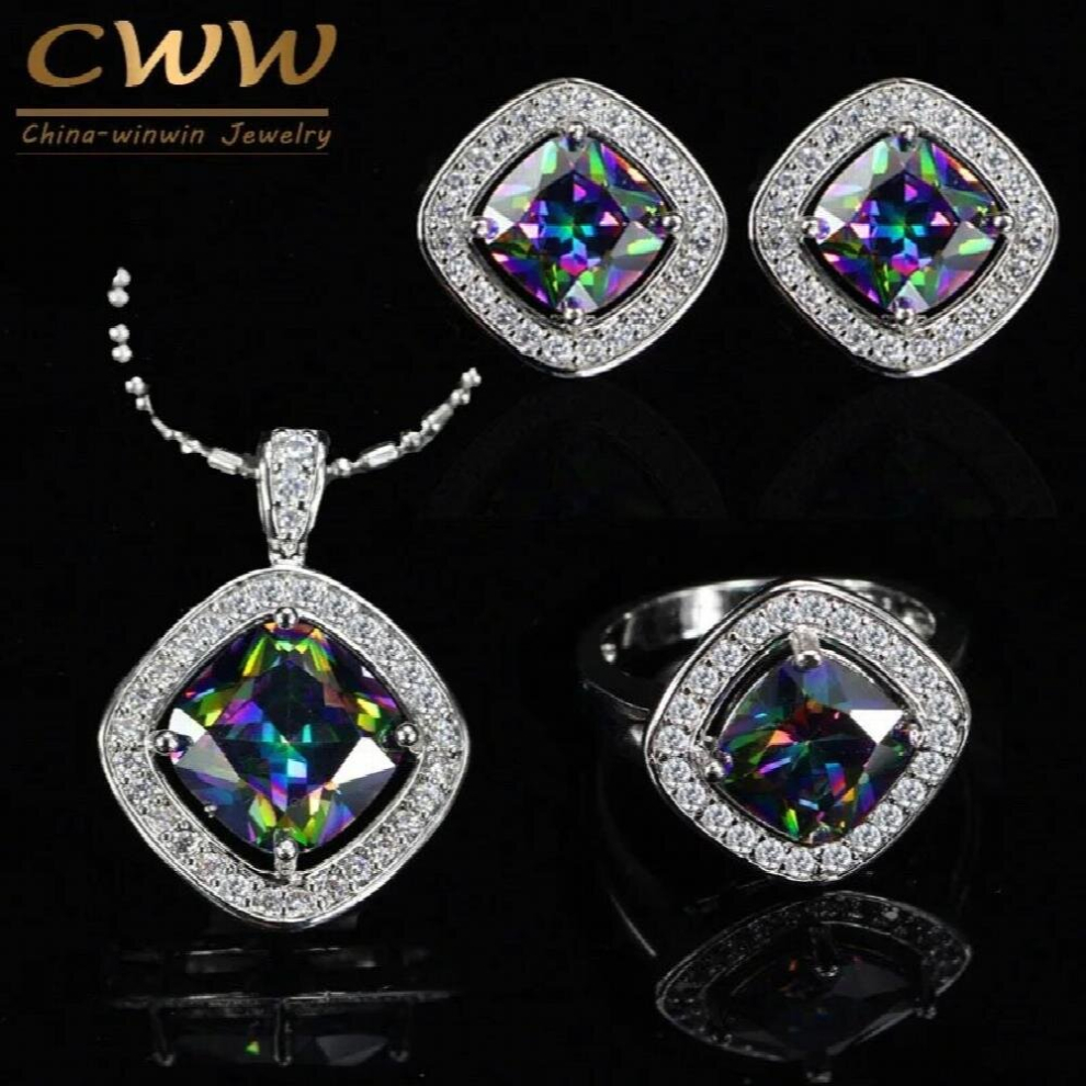 CWWZircons Square Mystical Colorful Crystal Jewelry Set For Women Cubic Zirconia Necklace Earring And Ring Sets T264