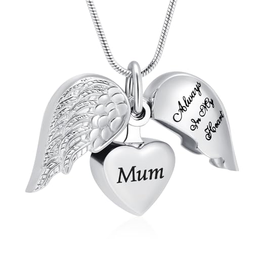 VCCWYQK Angel Wing Heart Urn Necklaces for Ashes for Women Memorial Keepsake Pendant for Women Men Cremation Jewelry (Silver-Mum)