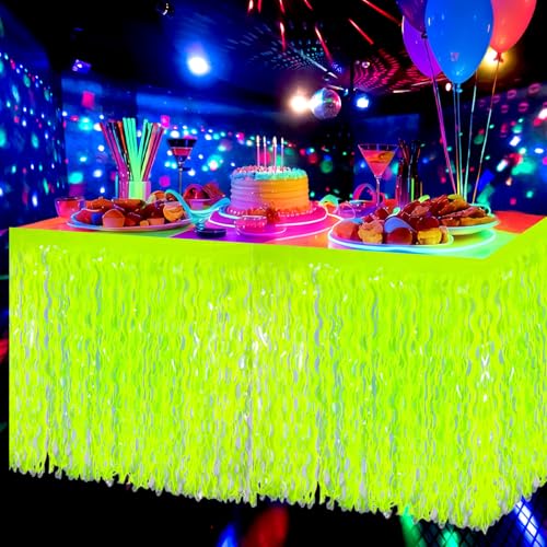 2 Packs Glow in The Dark Party Supplies Neon Party Table Skirts Streamers Decorations Green Wavy Metallic Tinsel Foil Fringe Banner Photo Booth Birthday Decorations 108 x 29.5 inch/each