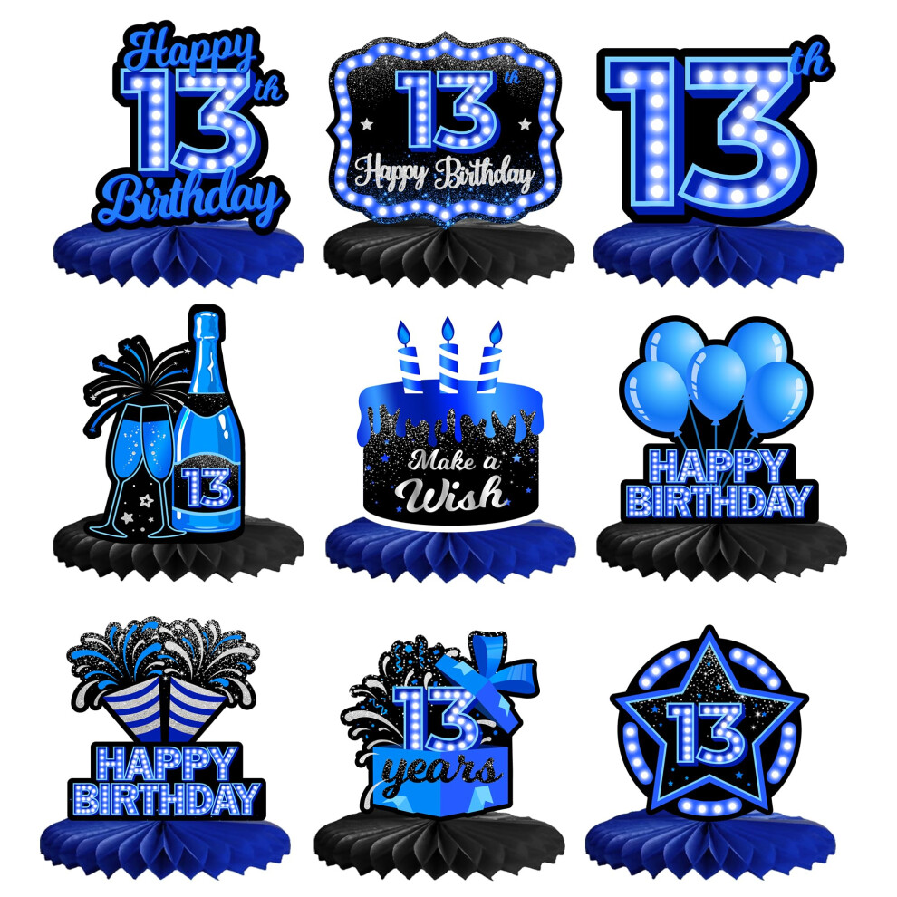 Happy 13th Birthday Honeycomb Centerpieces 9Pcs Stylish Sophisticated Blue Neon Theme Table Decor for Boys Girls Birthday Party Celebration Favors Dec