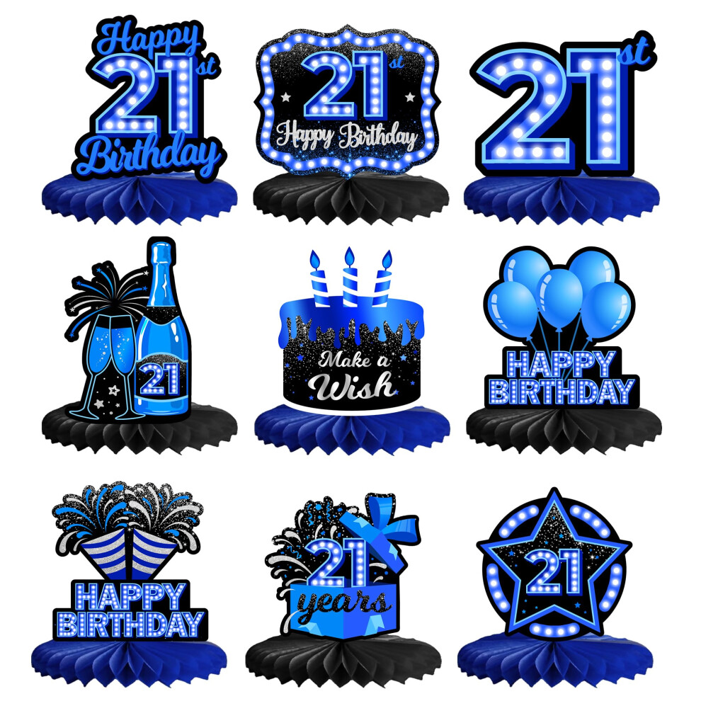 Happy 21st Birthday Honeycomb Centerpieces 9Pcs Stylish Sophisticated Blue Neon Theme Table Decor for Boys Girls Birthday Party Celebration Favors Dec