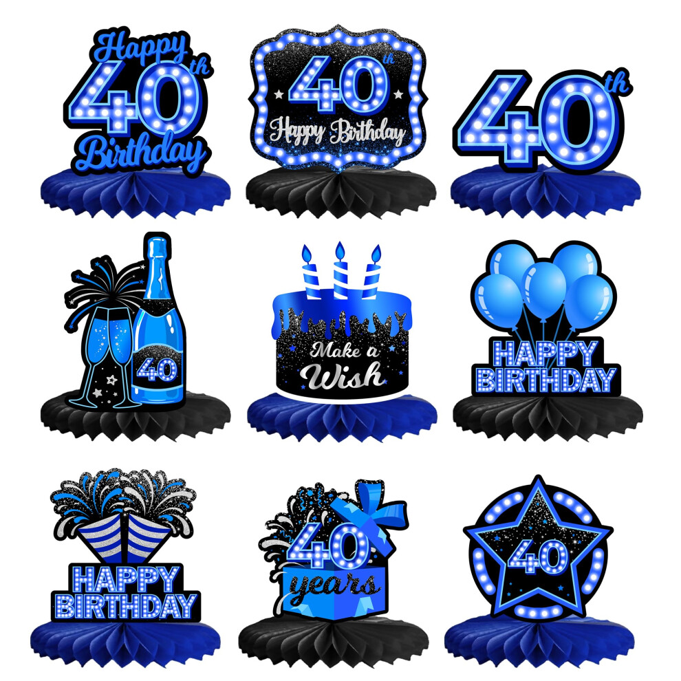 Happy 40th Birthday Honeycomb Centerpieces 9Pcs Stylish Sophisticated Blue Neon Theme Table Decor for Boys Girls Birthday Party Celebration Favors Dec