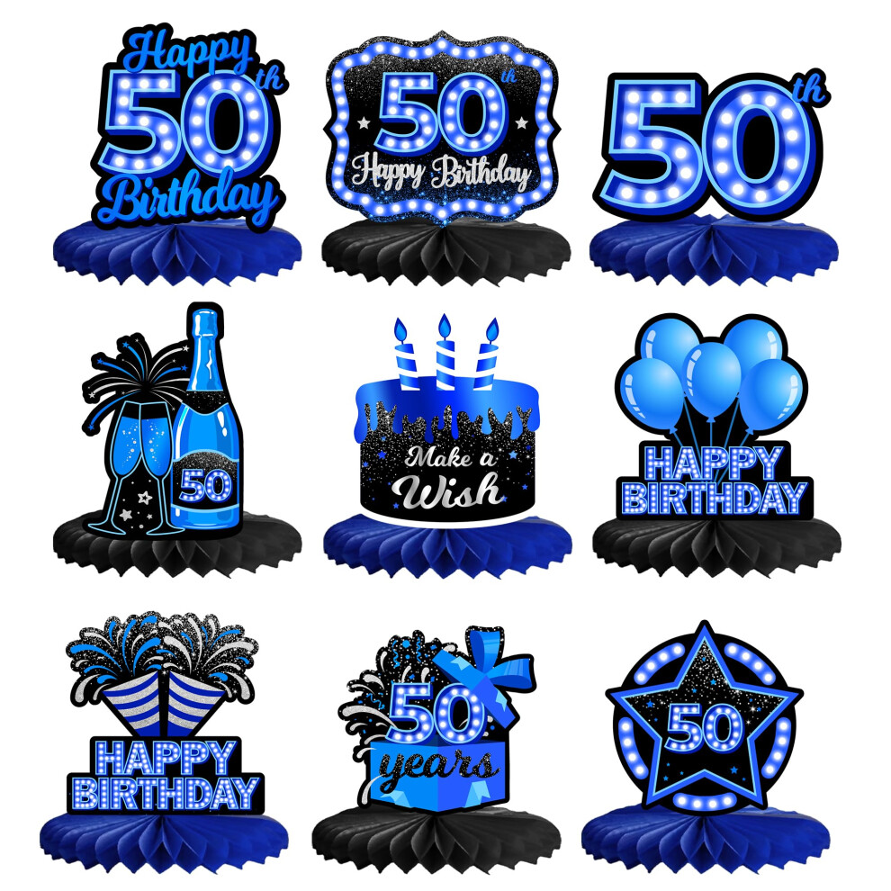 Happy 50th Birthday Honeycomb Centerpieces 9Pcs Stylish Sophisticated Blue Neon Theme Table Decor for Boys Girls Birthday Party Celebration Favors Dec