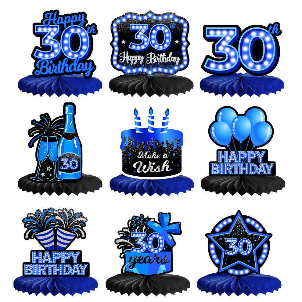 Happy 30th Birthday Honeycomb Centerpieces 9Pcs Stylish Sophisticated Blue Neon Theme Table Decor for Boys Girls Birthday Party Celebration Favors Dec