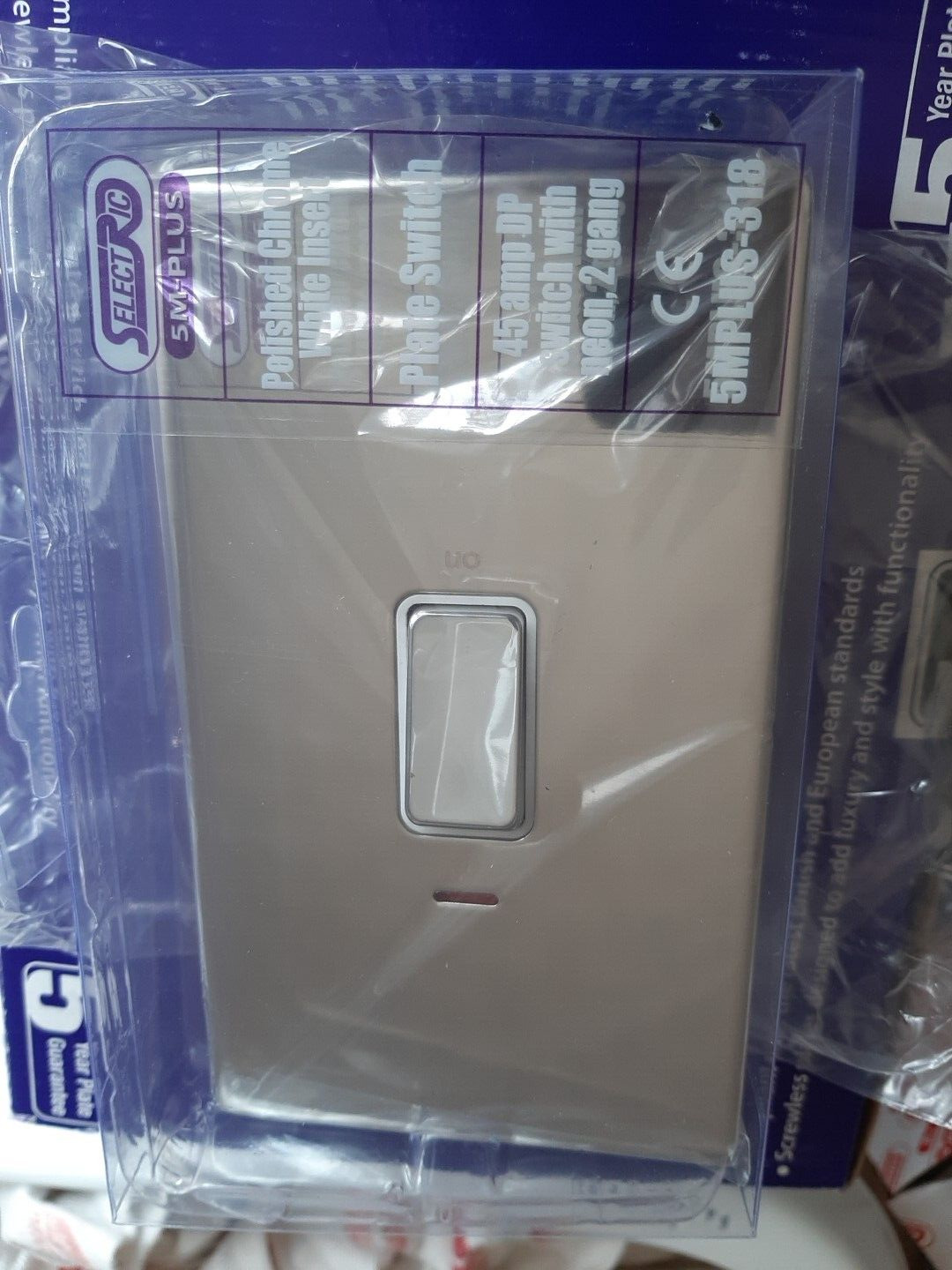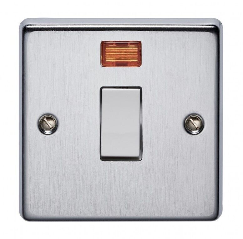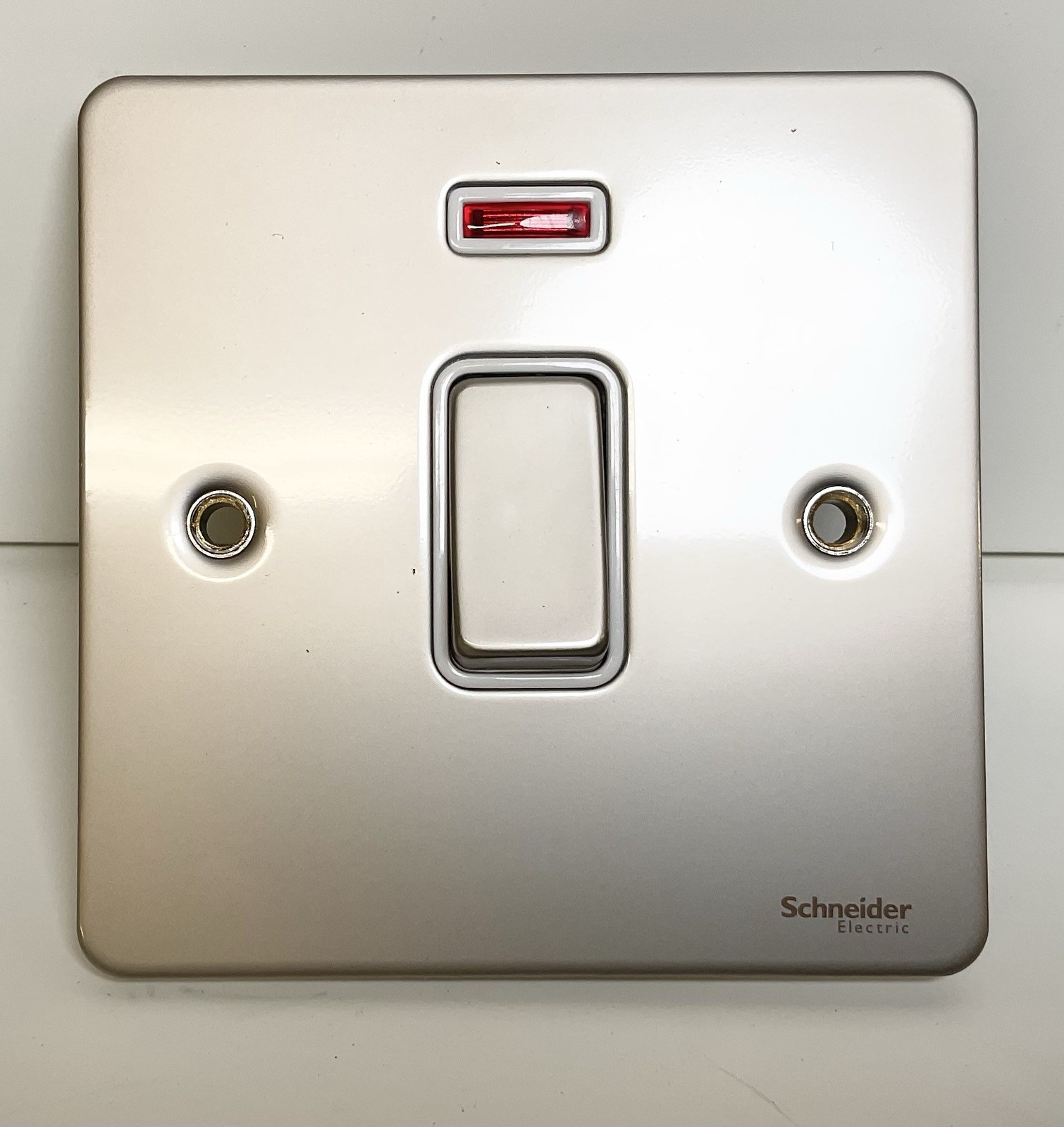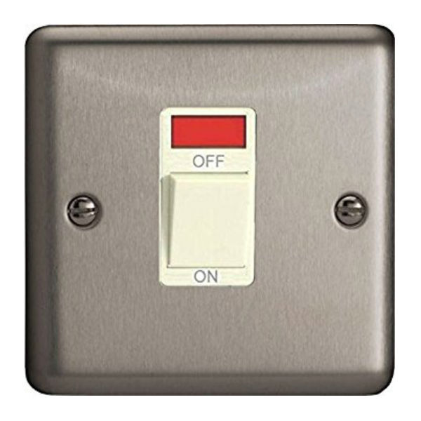 MK (ELECTRIC) Dimensions 1 Gang 32A Dp Switch And Neon Satin Steel Finish Frontplate With A White Trim
