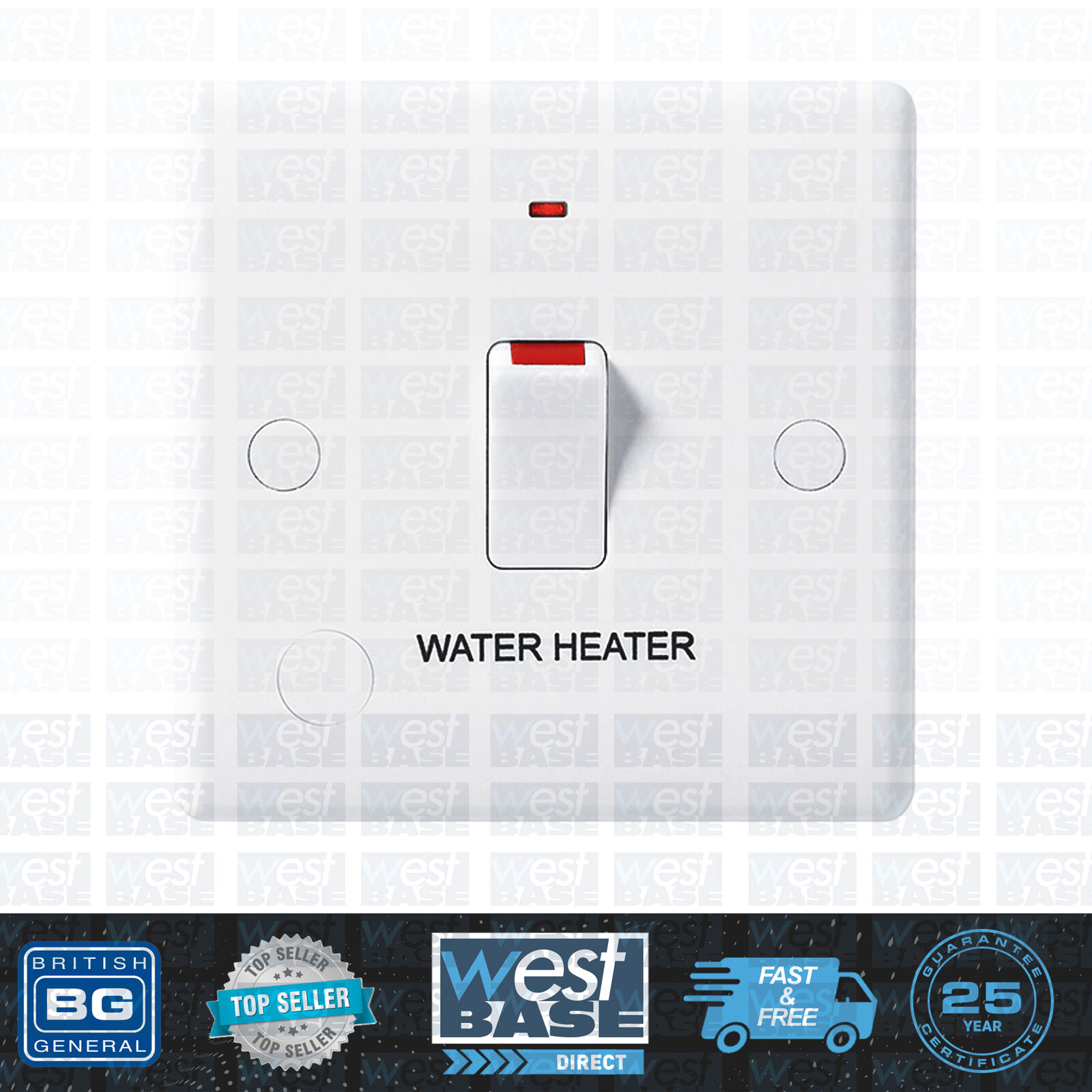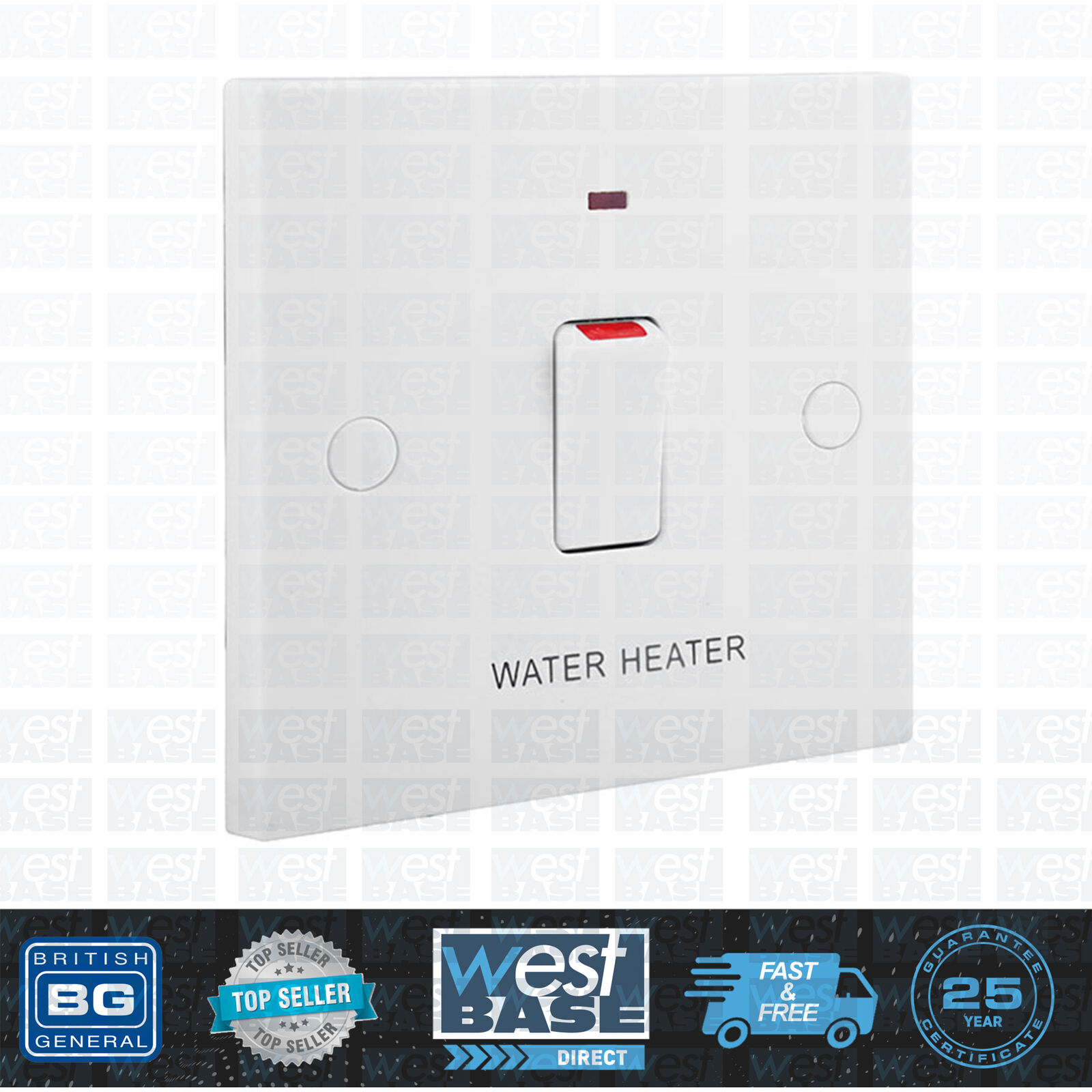BG 833WH White Round Edge 20A DP Switch marked Water Heater + Neon +Cable Outlet