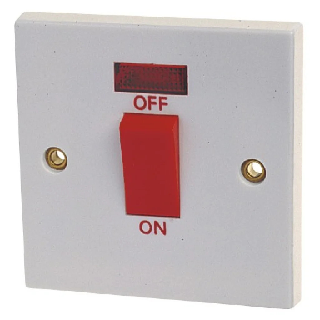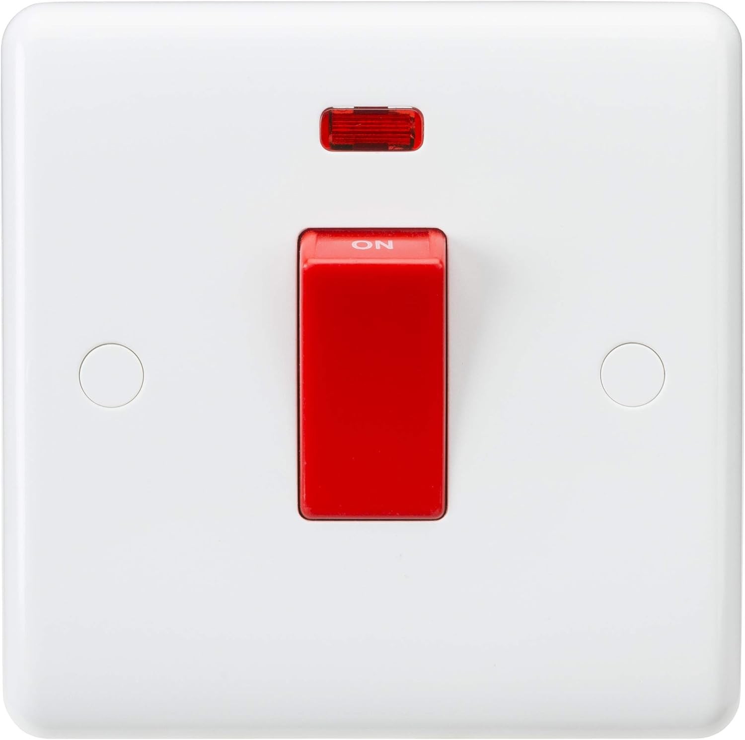 Knightsbridge CU8331N Curved Edge 1 Gang DP Switch and Neon in White with White Rockers, Cooker 45A Red Switch + Neon