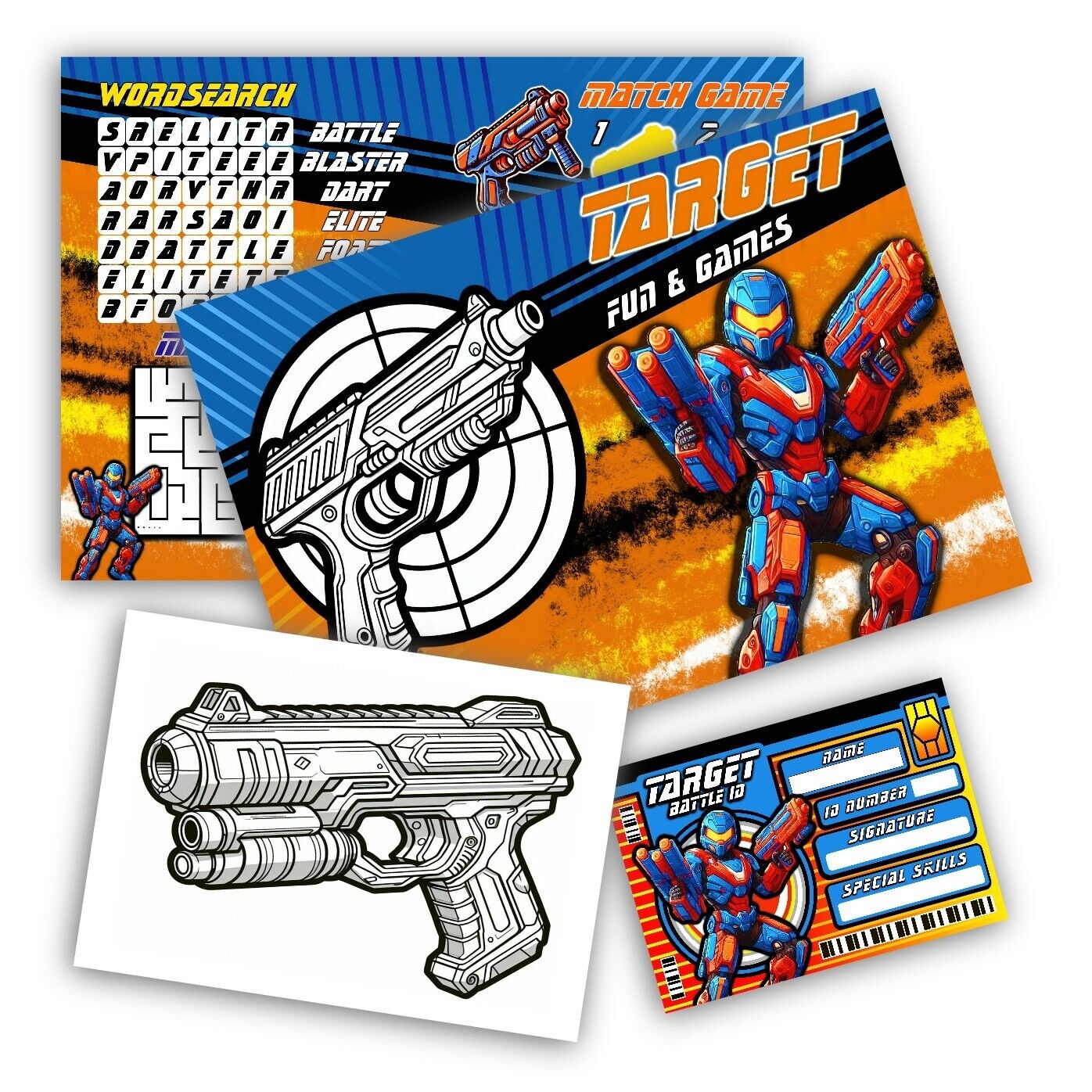 Pack of 12 - Target Battle Fun and Games Activity Sheets - Nerf-Themed Activity