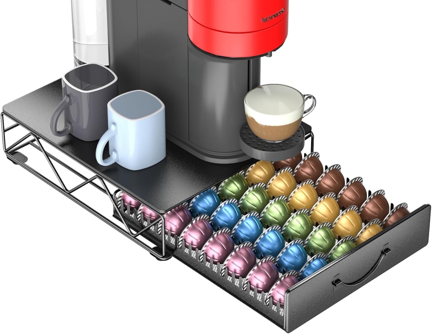 Multifunctional Metal Vertuoline Coffee Pod Holder for 60 Small or 40 Large Vertuo Capsules Pods & 40 Dolce Gusto Pods,Nespresso Vertuoline Capsule Drawer Organizer Coffee Machine Stand
