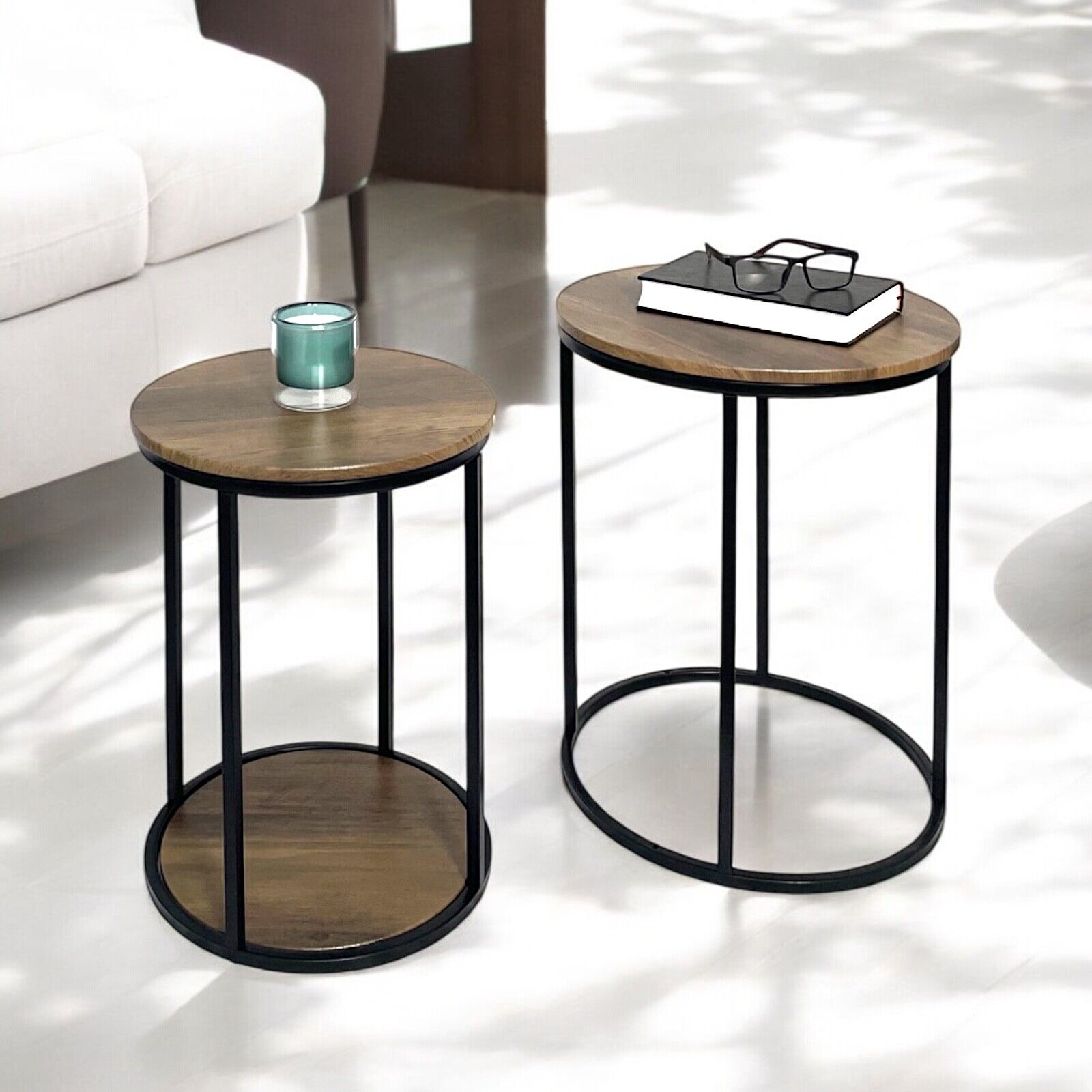 Nest of 2 Tables Rustic Oak Set of 2 Coffee Side End Table Black Metal Legs