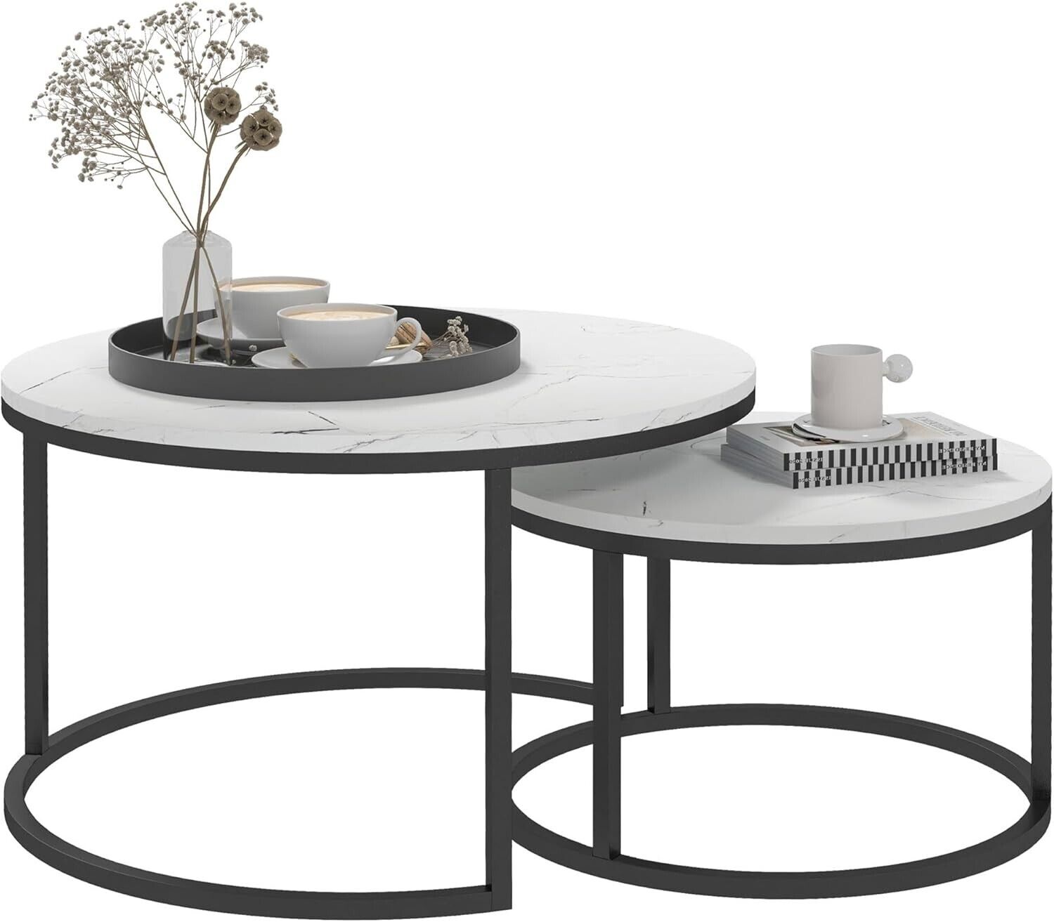 Nest of 2 Tables White Marble Round Tabletop Black Steel Frame Living Room Table