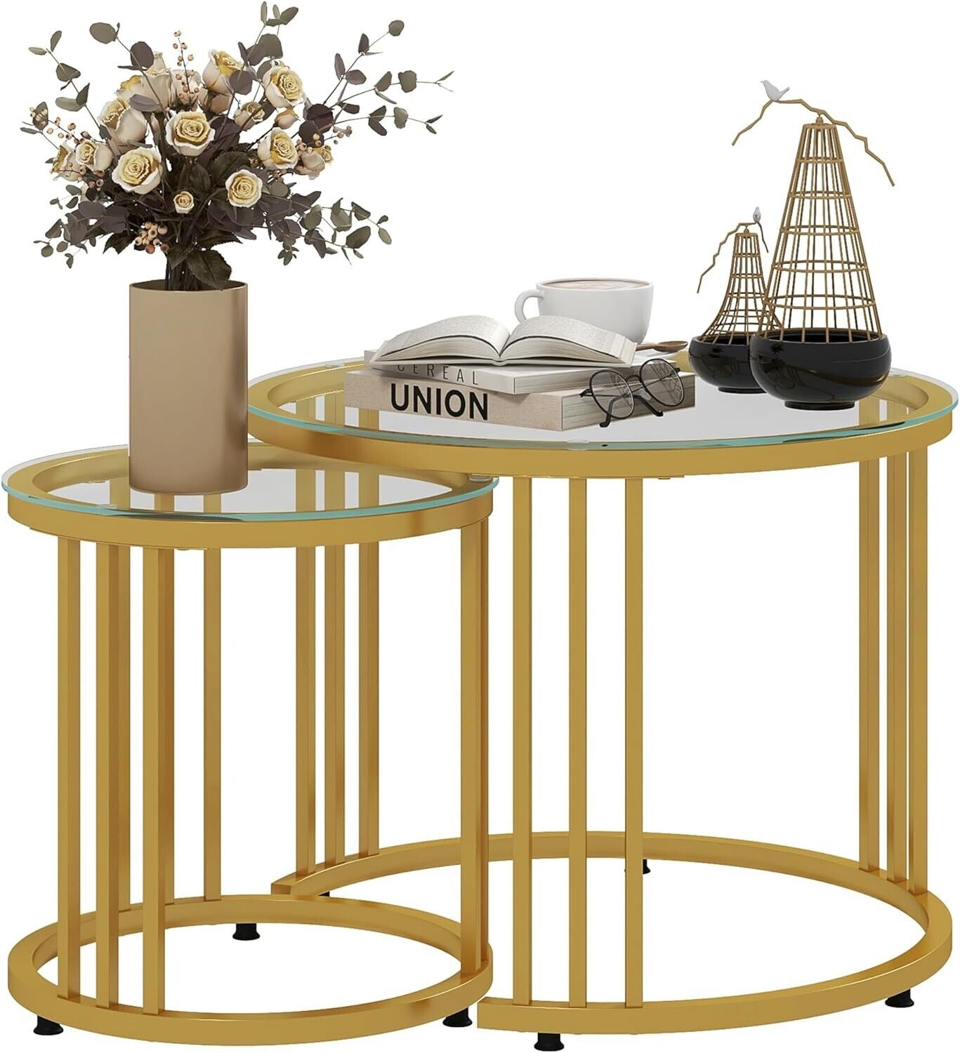 Round Nest of 2 Tables Glass Tabletop Gold Steel Frame Nesting Living Room Table