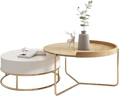 MAXCBD Round Nesting Coffee Table Set With Drawers Modern Coffee Table Wood And Man-made Board And Stainless Steel For Living Room Balcony Garden