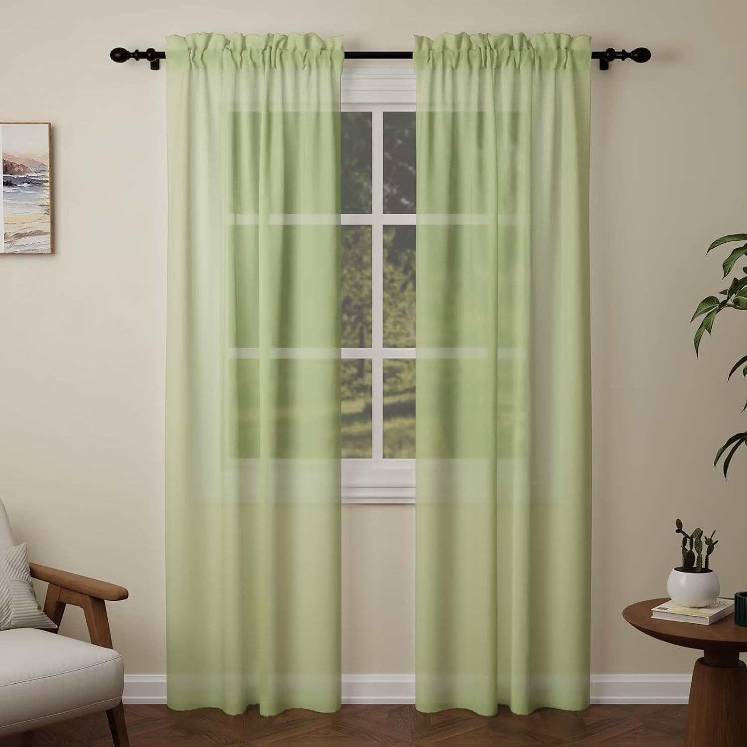 Pacok Green Voile Curtains, 90 Drop 2 Panels Net Curtain for Windows, Rod Pocke
