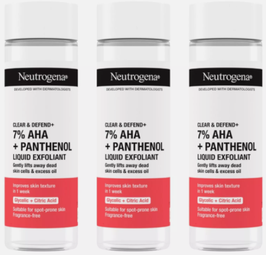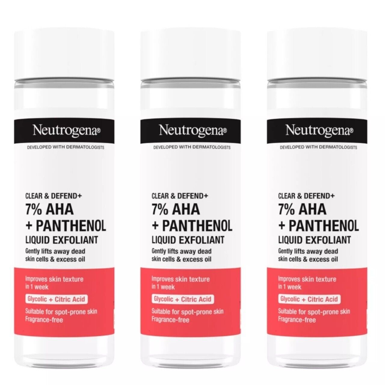 3 X Neutrogena Clear & Defend 7% AHA + Panthenol Liquid Exfoliant 125ml.