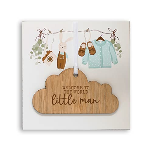 New Baby Girl/Baby Boy Card With Wooden Hanging Cloud Plaque Keepsake - Welcome To The World Little Lady/Little Man Gift (Blue)