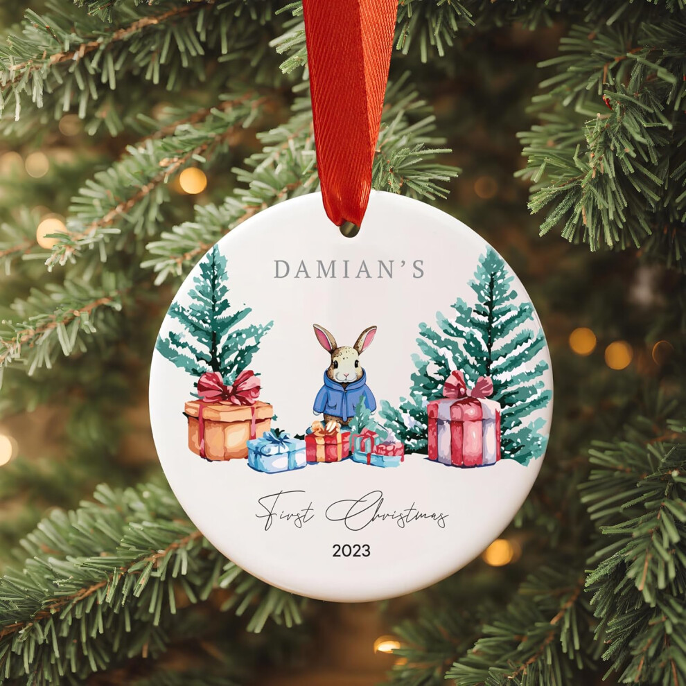 (Blue Rabbit) Personalized Baby's First Christmas Ornament, Customizable Rabbit Coat Colour, Bauble Keepsake, New Baby Boy & Girl Gift Personalised Ne