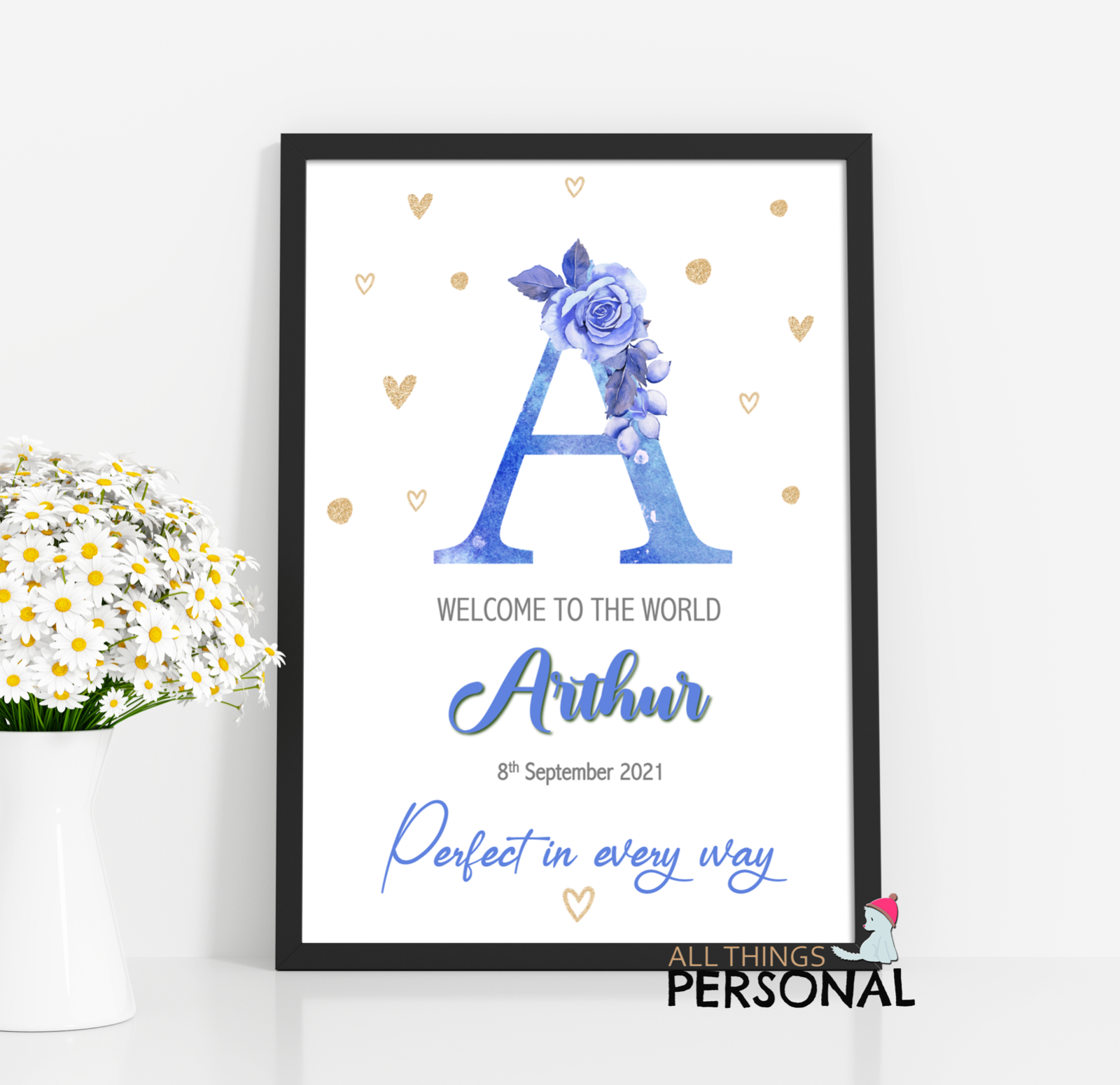 Personalised New Baby Boy Gift Welcome Print Christening Present Blue Floral