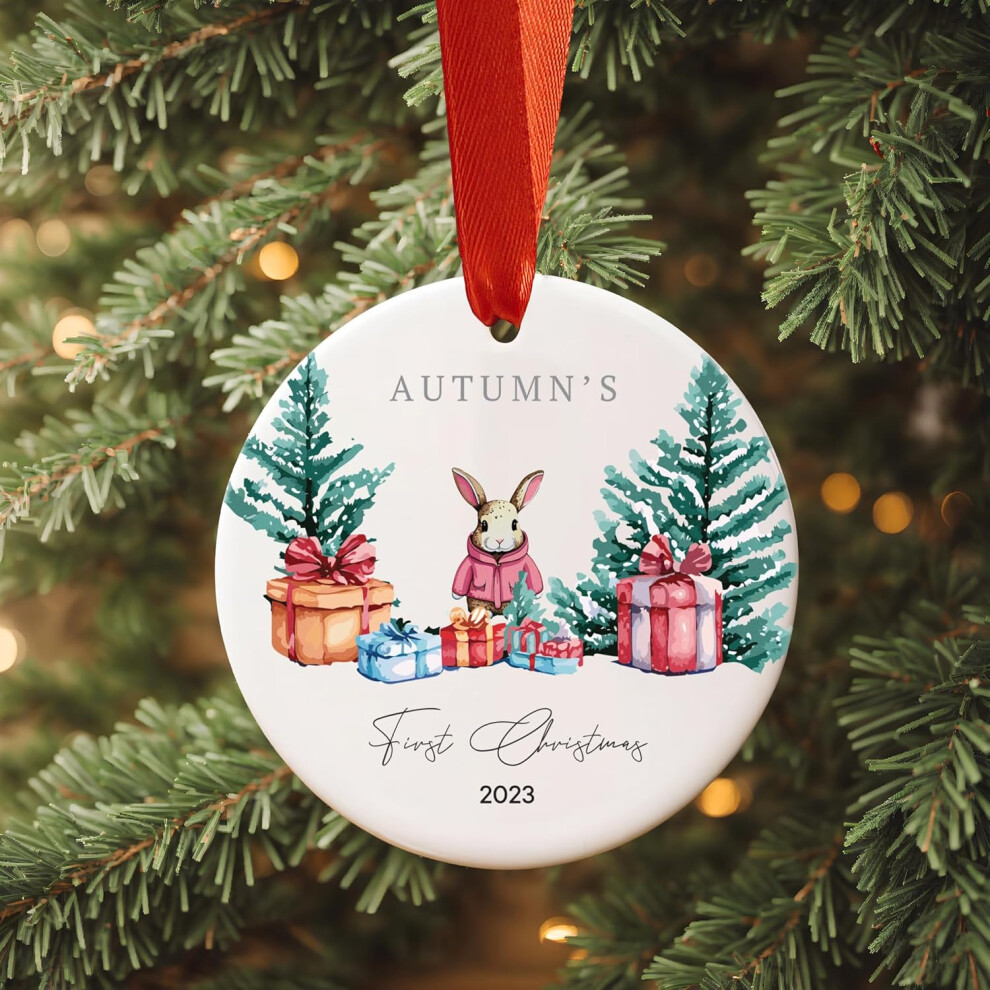 (Pink Rabbit) Personalized Baby's First Christmas Ornament, Customizable Rabbit Coat Colour, Bauble Keepsake, New Baby Boy & Girl Gift Personalised Ne