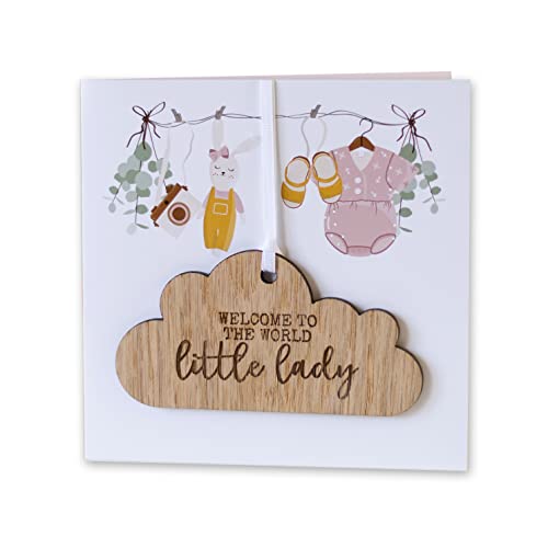 New Baby Girl/Baby Boy Card With Wooden Hanging Cloud Plaque Keepsake - Welcome To The World Little Lady/Little Man Gift (Pink)