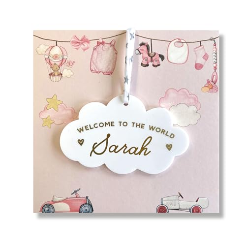 New Baby Girl or Baby Boy Card With Personalised Cloud Keepsake Gift - Welcome To The World Little One New Baby Card, Liberty Ribbon to Hang (Pink Card)