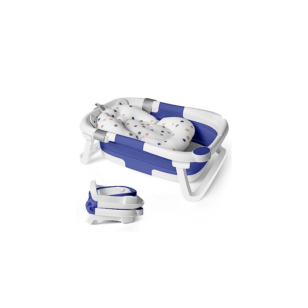 Collapsible Baby Bath Foldable Tub Bathtub Newborn with Seat Support Cushion Stand Folding Baths for Toddler 0-6 12 24 Months Foam Pillow Travel