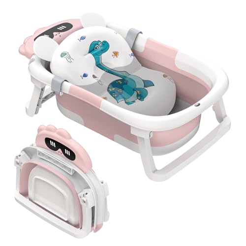 Baby Bath Tub Foldable, Baby Bath Essentials for Newborn with Non-Slip Mat Collapsible Toddler Bathtub Baby Bathtub Newborn to Toddler 0-24 Months Portable Travel Multifunctional Baby Bath Tub, Pink