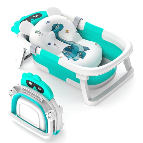 COOSEYA Foldable Baby Bath Tub for Newborn, Collapsible Baby Bathtub with Soft Support Cushion (0-18Months), Baby Shower for Infant to Toddler Gift, Travel Outdoor Design (Green)