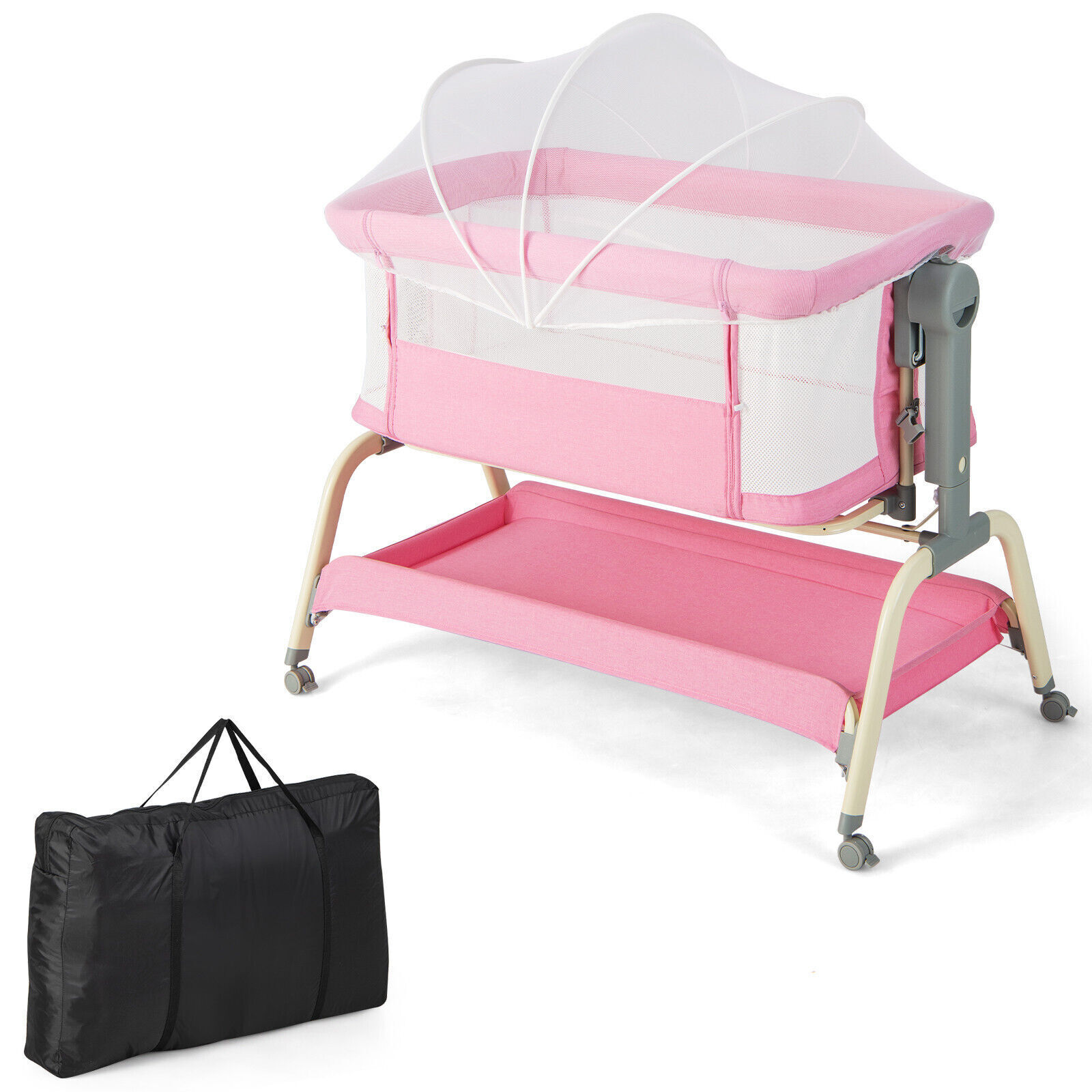 Little Bambino Bedside Crib for Baby, Bassinet Sleeper with Wheels, Height Adjustable, Tilts & Rocks, with Mosquito Nets, Large Storage Bag, for Infant/Baby/Newborn (Pink)
