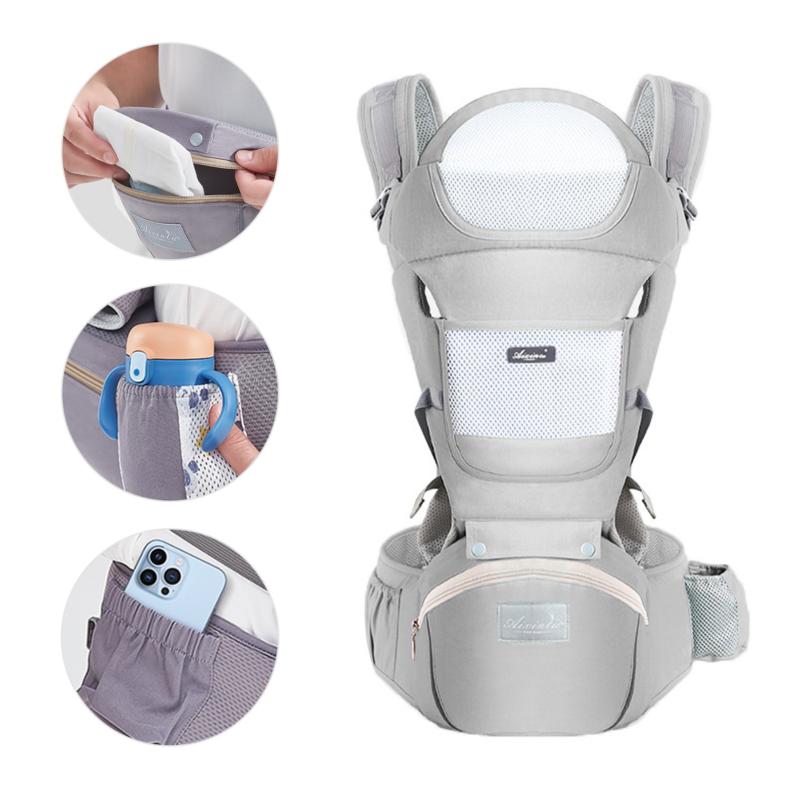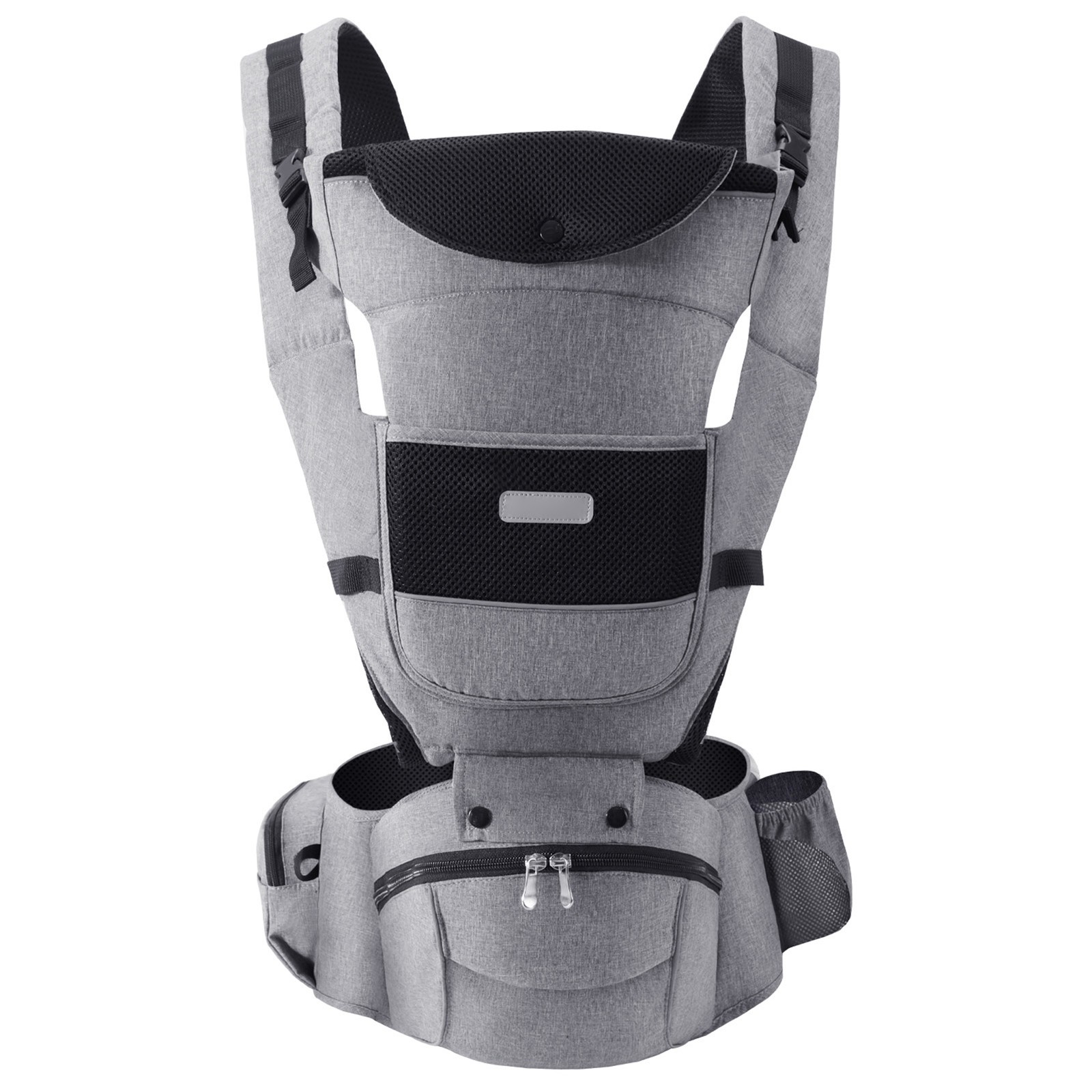 Bebamour Baby Carrier Newborn to Toddler Baby Carrier Hipseat 0-36Months with Head Hood, 3 PCS Teething Pads, Waist Extender, Storage Bag & Pacifier Case (Mesh Grey)