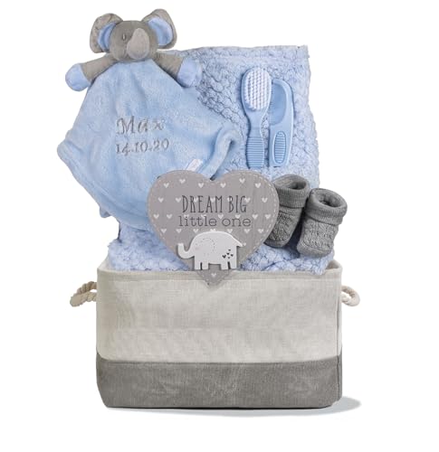 Personalised Baby Gift Basket for Boys Blue Large Gift Baby Hamper Boy Newborn Embroidered Elephant Comforter Baby Shower Special Unique New Custom Soft Cute
