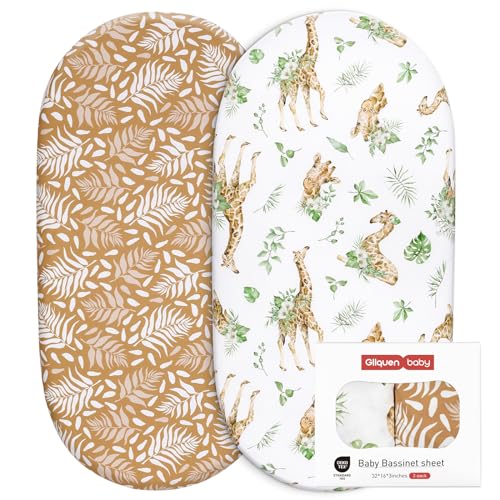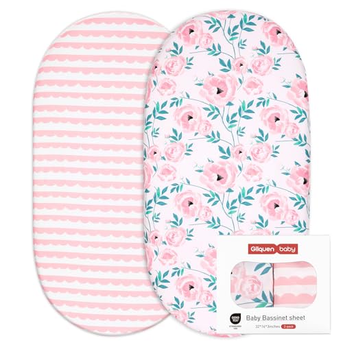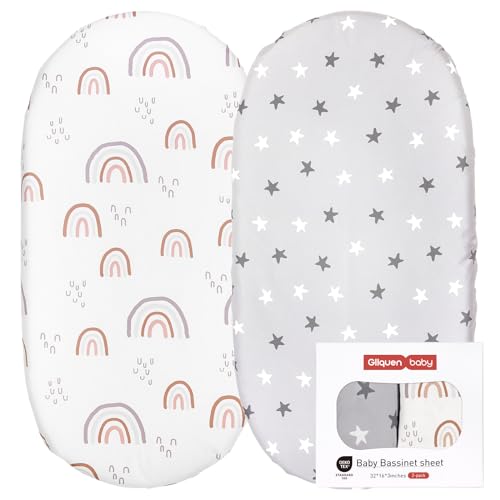 2 Packs Moses Basket Sheets 32”*17“ Newborn Pram Sheet Cozy and Lightweight Muslin Bassinet Fitted Sheet Cotton Crib Sheets Baby Fitted Sheets for Boy and Girl Oval, Hourglass & Rectangle Bassinet