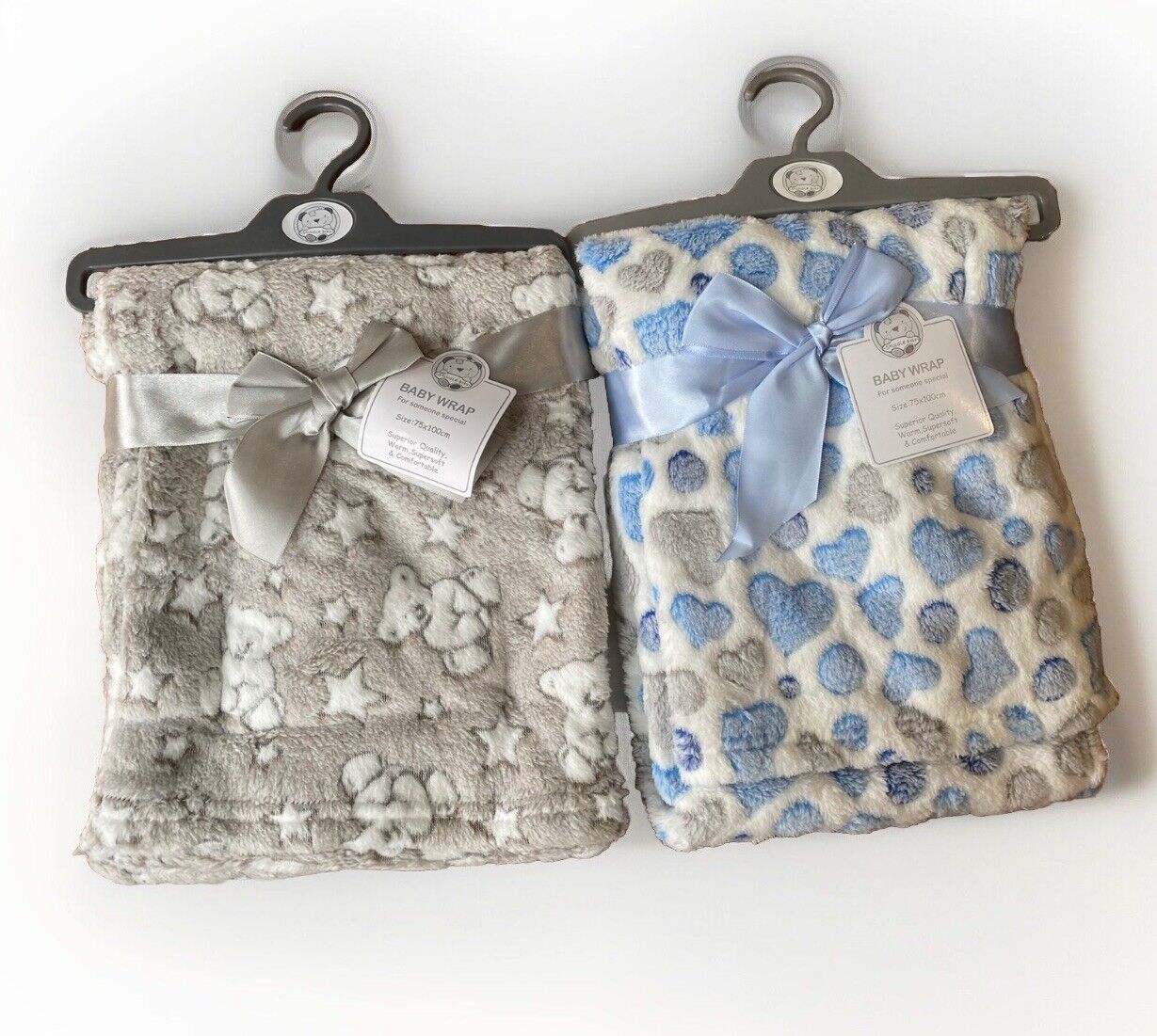 Set of Baby Boy Girl Soft Fleece Blanket Newborn Pram Crib Blue Heart+Grey Teddy