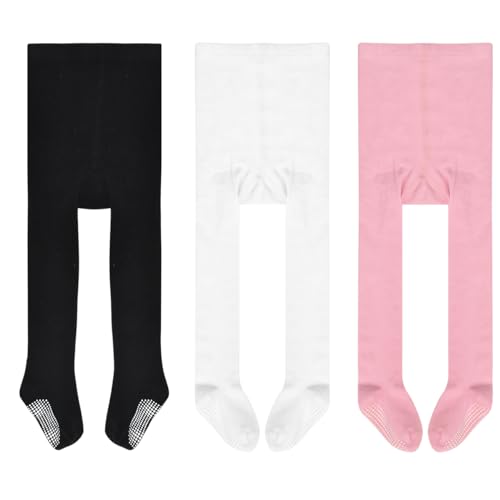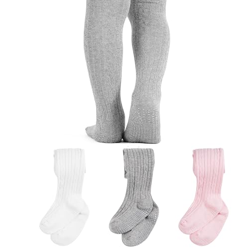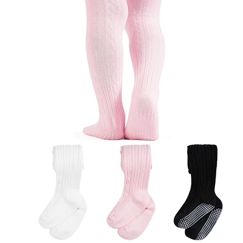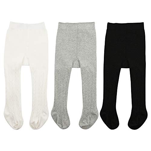 ZERULETS Baby Girls Tights Non Slip 3 Pack Cable Knite Cotton Rich Pantyhose for Newborn Infant Toddler (1 Years-2 Years) - Black White Pink Grey