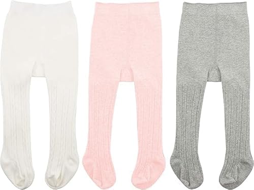 Zando Newborn Baby Tights, 3 Pairs Cotton Baby Girl Clothes, Tights For Girls, Cozy Winter Leggings With Cable Knit Design, Light Pink White Light Grey, 0-6 Months