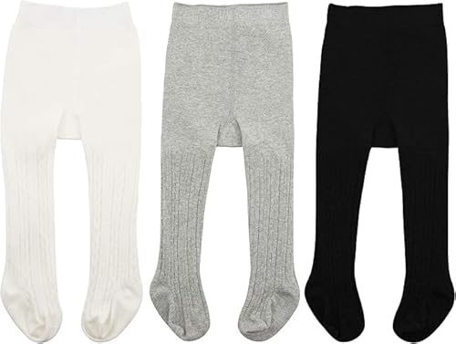 Zando Newborn Baby Tights, 3 Pairs Cotton Baby Girl Clothes, Tights For Girls, Cozy Winter Leggings With Cable Knit Design, White Black Light Grey, 0-6 Months
