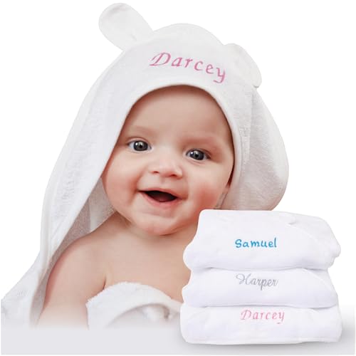 Personalised Newborn Baby Hooded Bath Towel - Soft, Cuddly, Highly Absorbent and Machine Washable Towel with Ears for Your New Baby Girl or Boy that will Grow with them, 75cm x 75cm