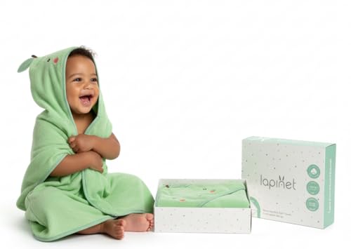 Lapinet 100% Organic Cotton Luxury Baby Hooded Bath Towel, Boy & Girl Gender Neutral Green Apple Fruit Design, Soft & Absorbent Infant Essential, New Parent Gift for Newborn to Toddler 75x75cm