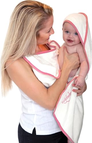 Cuddledry Hands Free Baby Bath Towel | Luxuriously Soft Bamboo & Cotton Hooded Baby Towel | Apron Towel for Safe Babies Bathtime | Perfect Newborn Gift | Pink Edging