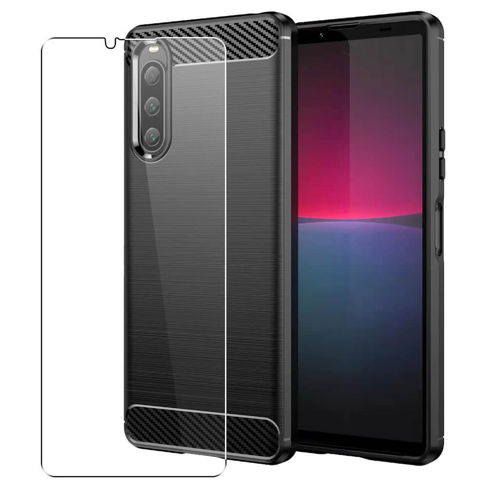 Carbon Case for Sony Xperia 10 VI Phone Cover and Glass Screen Protector Black