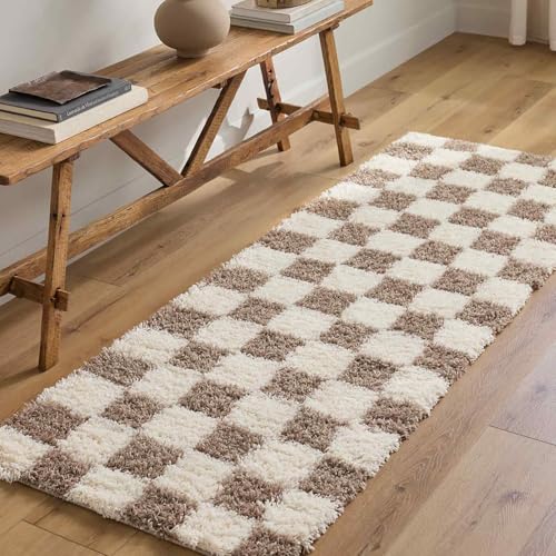 Livabliss Mabini Shaggy Rug - Modern Runner Rugs Living Room, Hallway 80x220 cm, Soft Shaggy Rugs for Bedroom - Neutral Boho Fluffy Rug, Easy Care Plush Thick Pile - Cream and Dark Brown