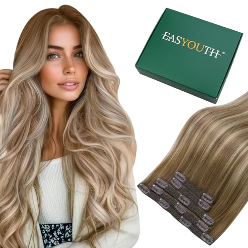 Easyouth Clip in Hair Extensions Real Human Hair Ombre Human Hair Extension Clip ins Dark Brown to Ash Brown and Medium Blonde Hair Extensions Clips in Human Hair Easy to Style 18 Inch 5Pcs 70g
