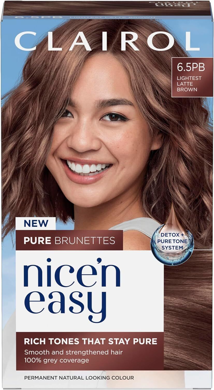 Clairol Nice n’ Easy Pure Brunettes Hair Colour | Pure and Rich Brown Tones | Smooth, Natural Hair Colour | With Pre-Colour Serum | 100% Grey Coverage | 6.5PB Lightest Latte Brown| Permanent Hair Dye