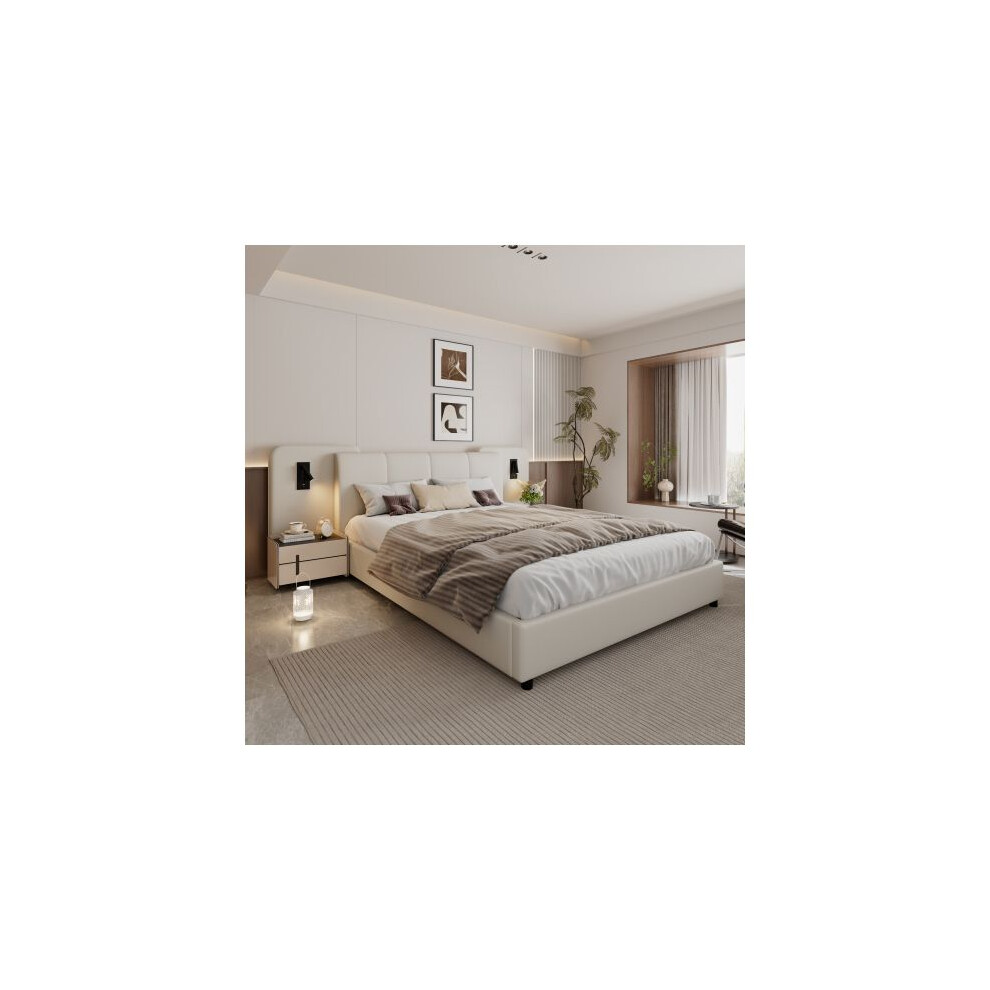 Upholstered Bed with Charging Ports and Night Lights 4'6" Twin Bed (135190 cm) PU Leather + Plywood Beige