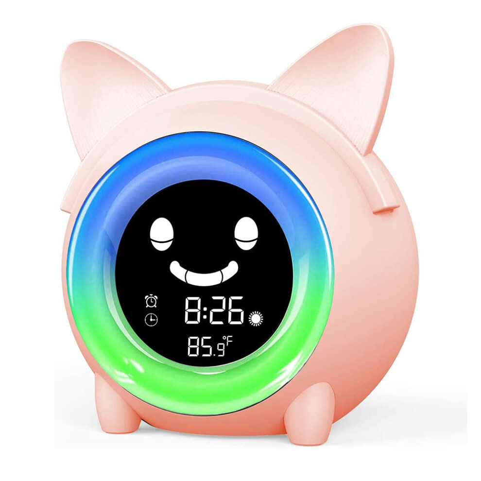 Adorable Cartoon Cat Kids Alarm Clock, Sleep Clock with Adjustable Night Lights and Temperature Display, Nap Timer and Sound Machine for Toddlers, St
