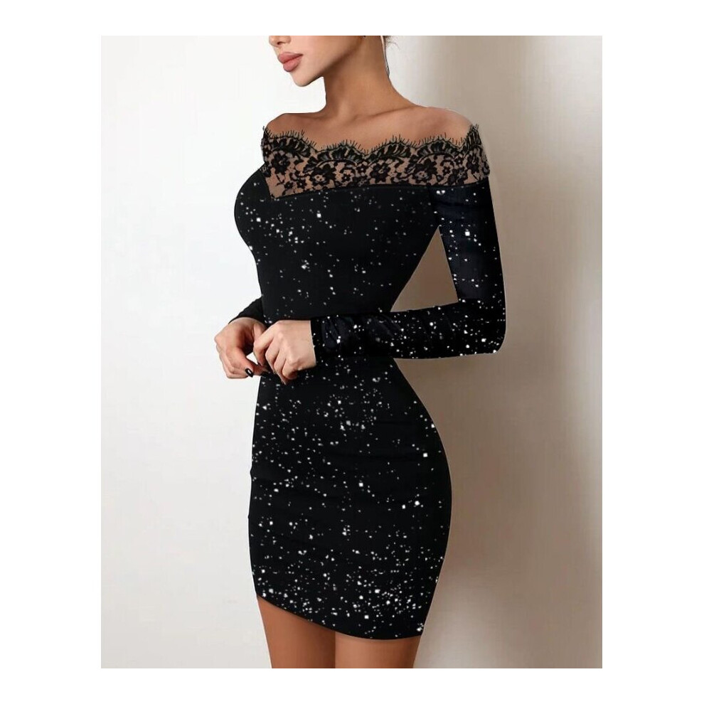 Sexy Party Night Out Dresses For Women Autumn Plain Off Shoulder Long Sleeve Contrast Lace Glitter Bodycon Mini Dress
