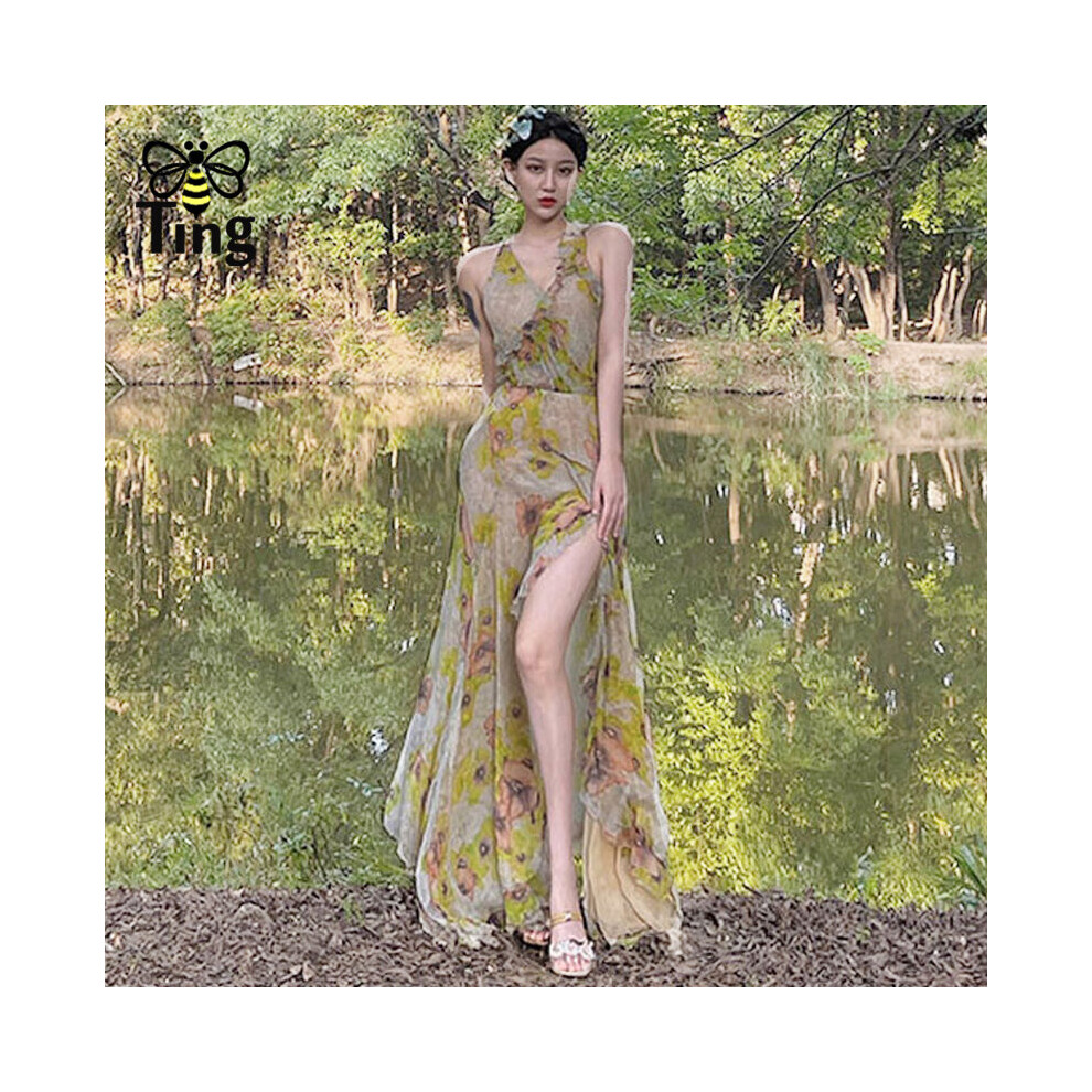 Tingfly Women Summer Sleeveless Floral Long Split Party Night Dresses Ruffles Boho Casual Chiffon Vestidos Slim Robes