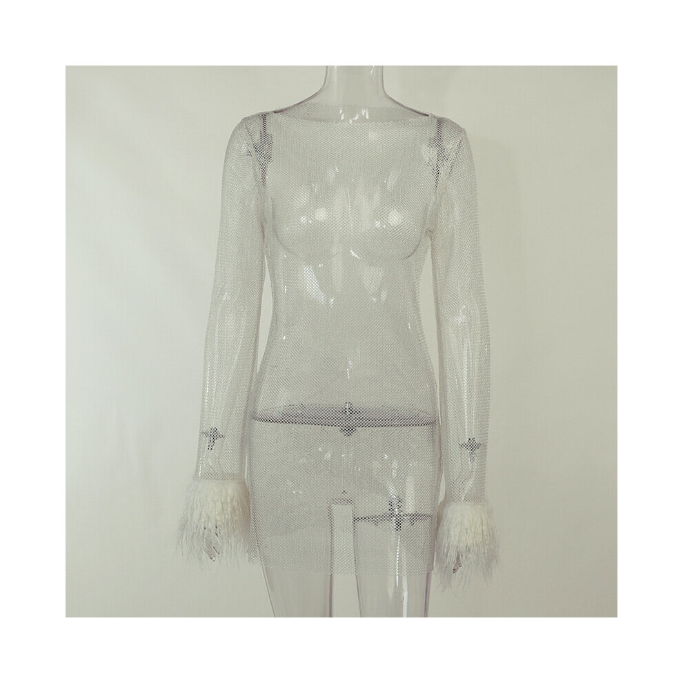 Sexy Feather Patchwork Long Sleeve Mesh Dress Women Autumn See-through Bodycon Package Hip Party Night Club Dresses