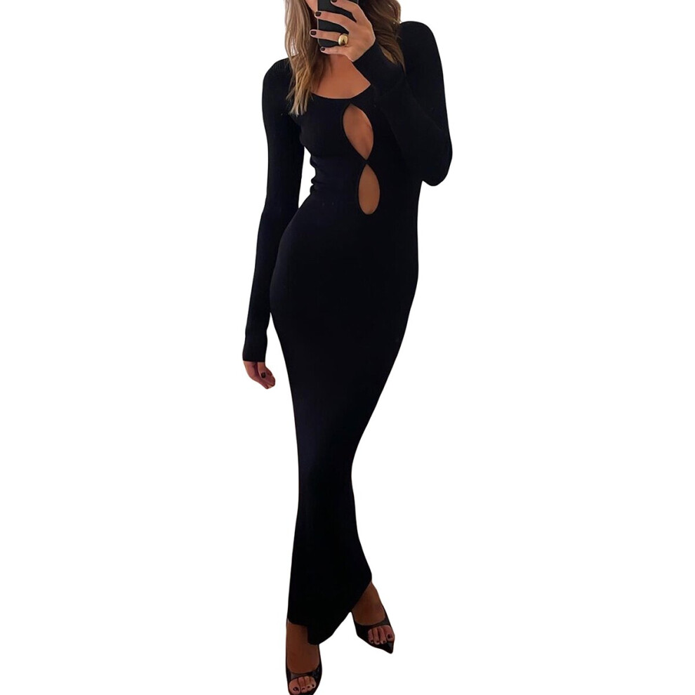 Women Spring Autumn Casual High Waist Slim Hollow Out Sexy Bodycon Long Dresses Night Party Solid Dresses